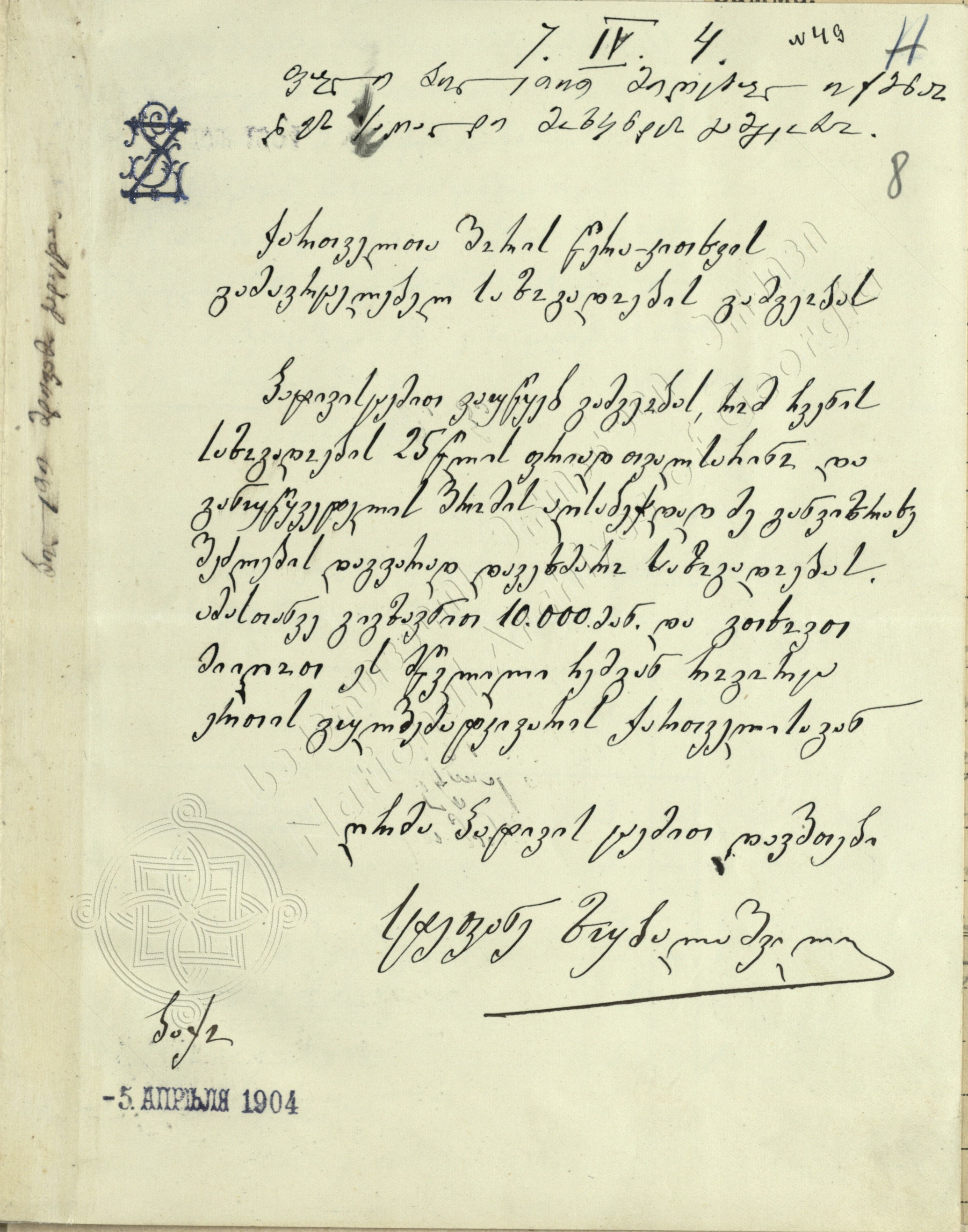 სტეფანე ზუბალაშვილის, ქართველი მრეწველისა და მეცენატის წერილი „წერა-კითხვის გამავრცელებელი საზოგადოების“ გამგეობისადმი საზოგადოების 25 წლის იუბილეზე 10 000 მანეთით დახმარების შესახებ. 1904 წლის 5 აპრილი.