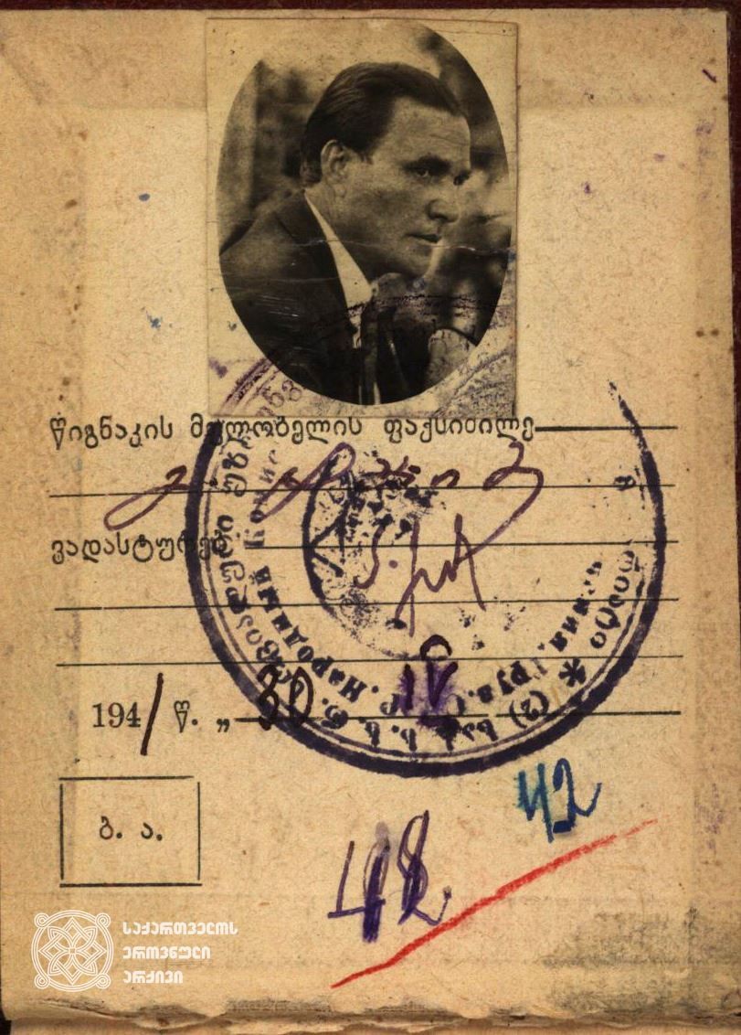 გალაკტიონ ტაბიძის საპენსიო წიგნაკის ფოტოსურათიანი გვერდი.