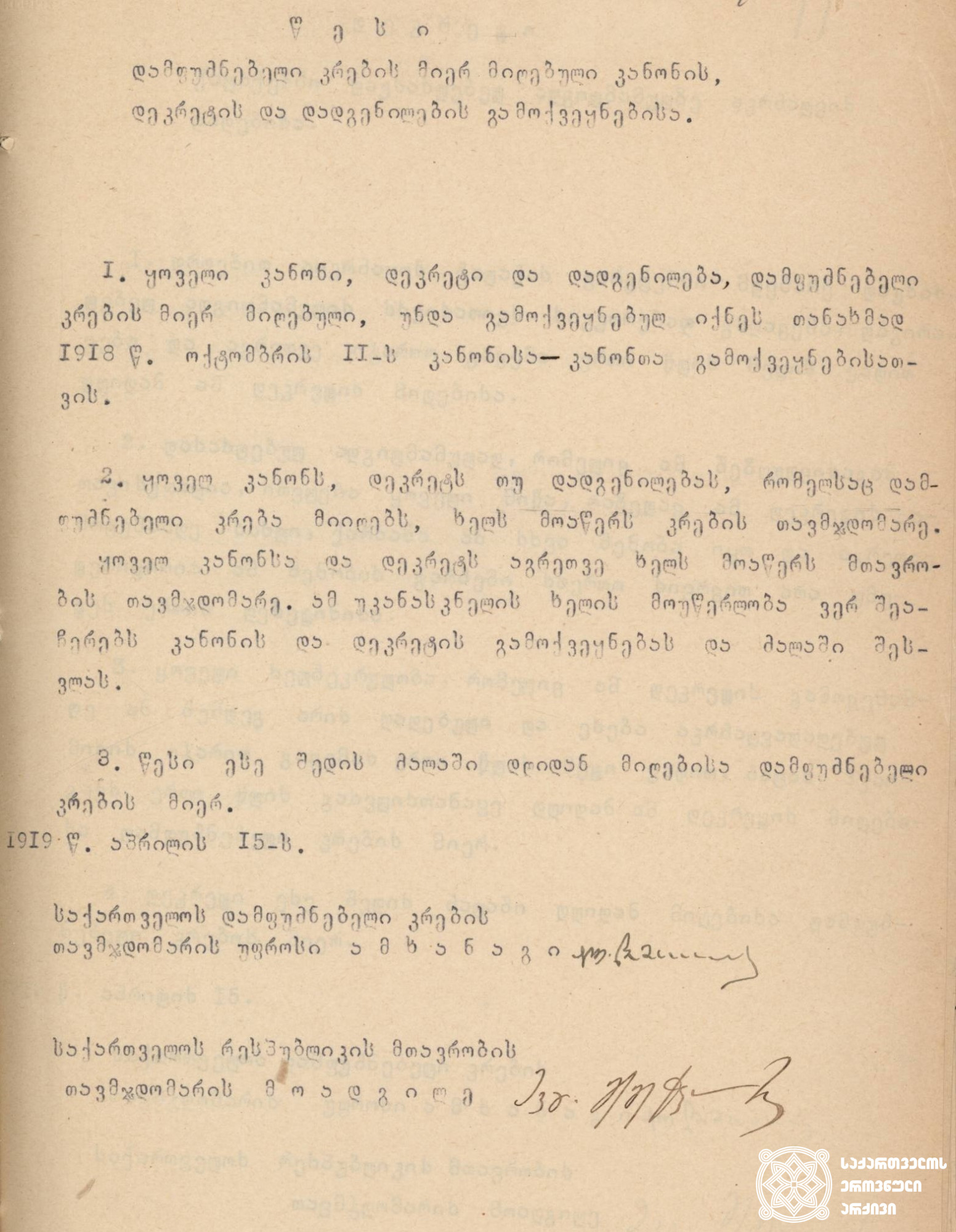 საქართველოს დემოკრატიული რესპუბლიკის დამფუძნებელი კრების მიერ მიღებული წესი „დამფუძნებელი კრების მიერ მიღებული კანონის, დეკრეტის და დადგენილების გამოქვეყნებისა“