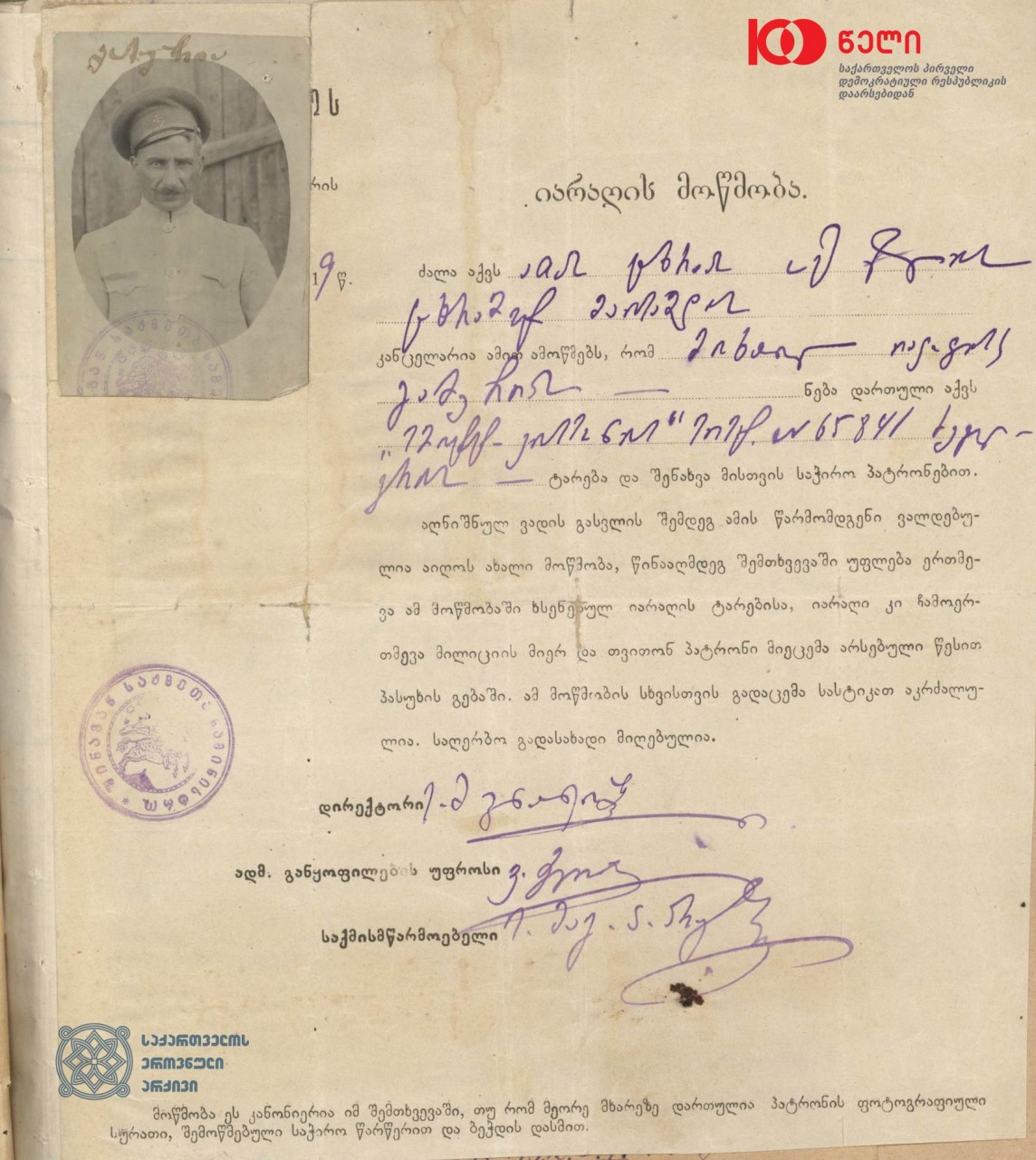 „იარაღის მოწმობა“ – 1919 წლის მაისში გაცემული იარაღის ტარების ნებართვა მოქალაქე მიხეილ გობეჩიაზე.