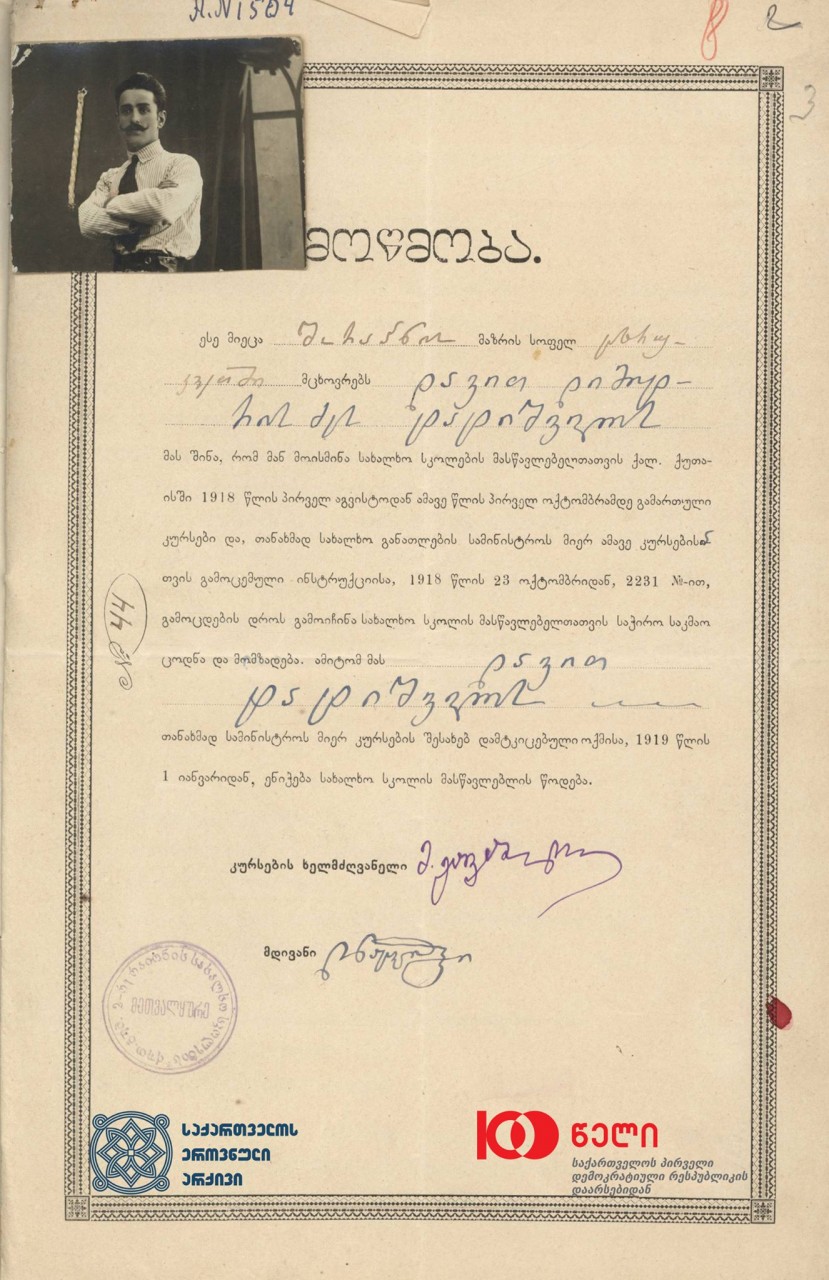 შორაპნის მაზრის სოფელ ცხრუკვეთში მცხოვრები დავით ტატიშვილის სახალხო სკოლის მასწავლებლის მოწმობა, გაცემული 1918 წლის ოქტომბერში.