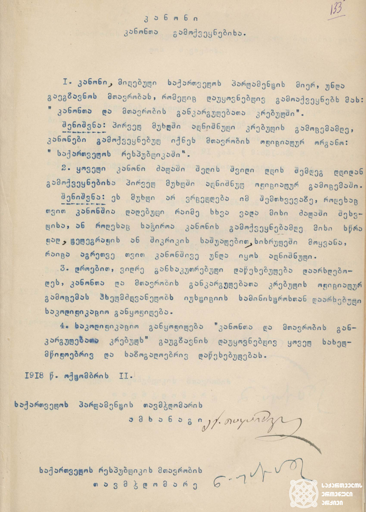 საქართველოს დემოკრატიული რესპუბლიკის ეროვნული საბჭოს მიერ მიღებული კანონი „კანონთა გამოქვეყნებისა“ 1918 წლის 11 სექტემბერი წყარო: ცსა, ფ. 1836, ან. 1, ს. 85